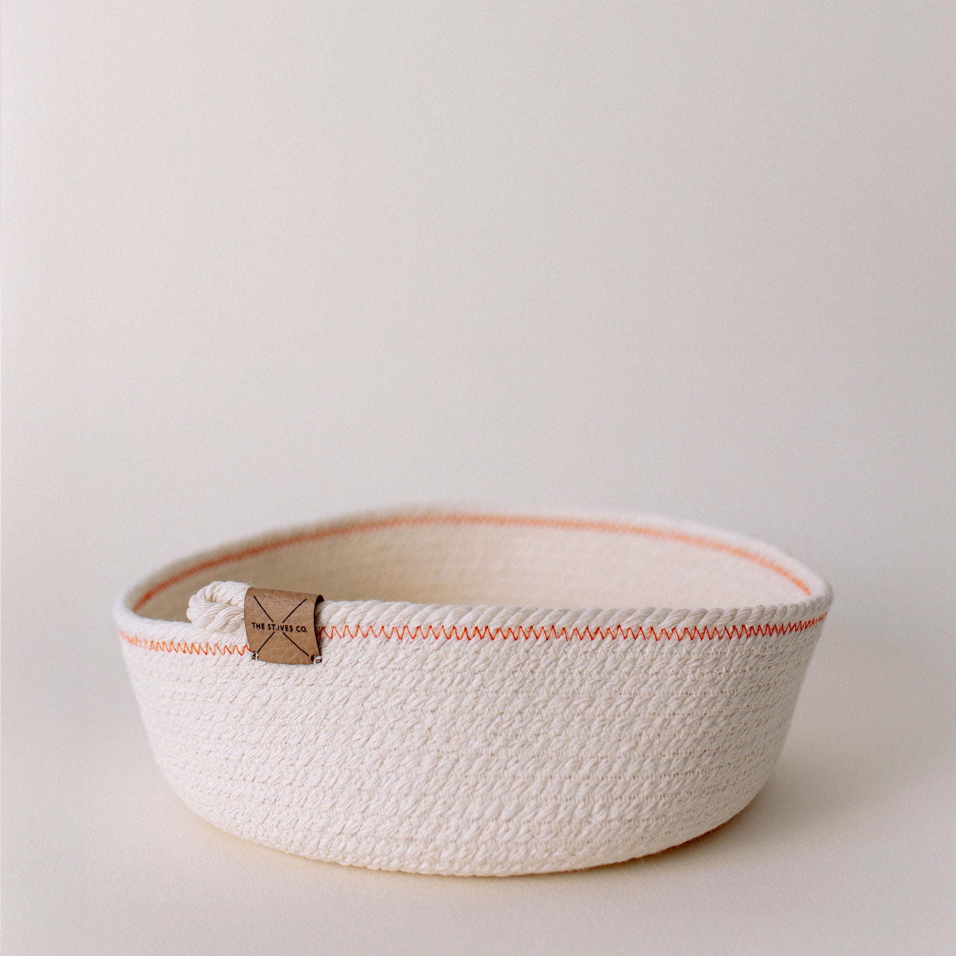 Large Cream rope bowl with orange stitching on edge. Made by hand from 100% cotton rope in Cornwall. Tag made from vegan leather and etched with The St. Ives Co.