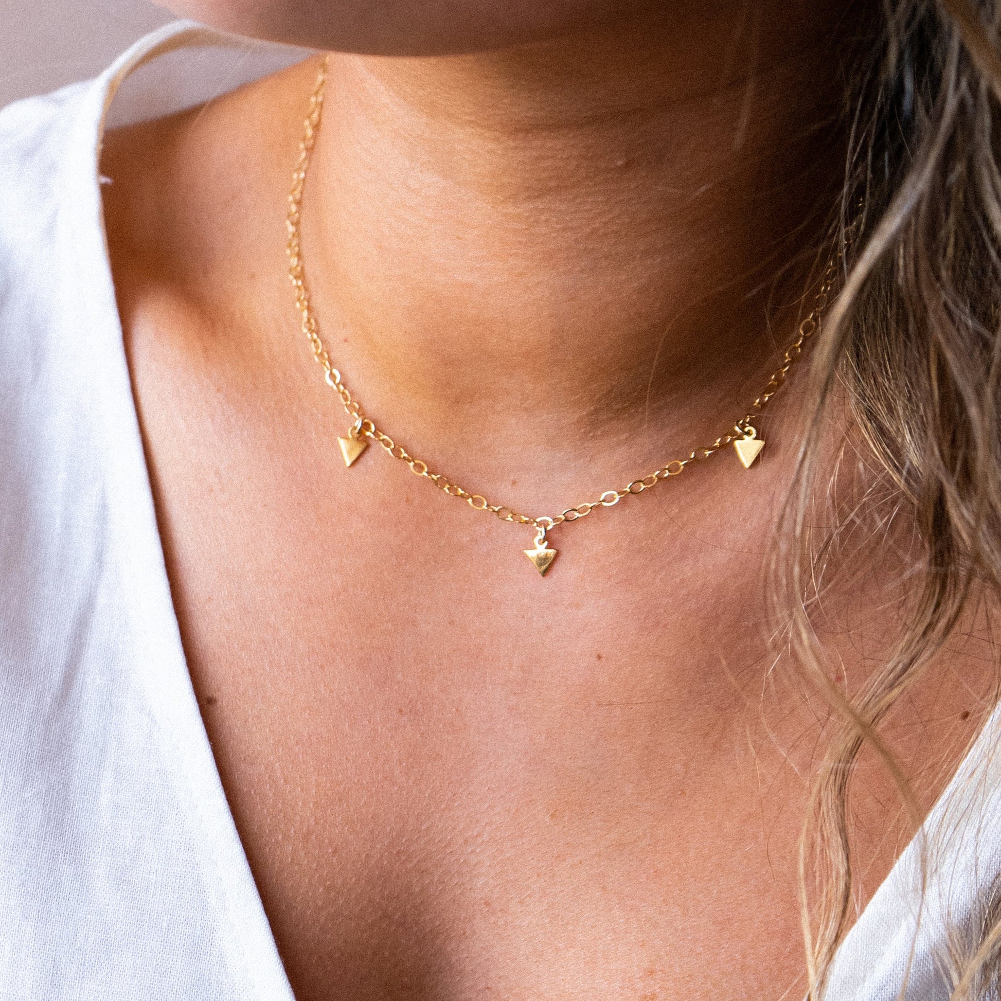 Gold plated arrow necklace. Flat link gold filled chain and clasp with decorative gold arrow charms.