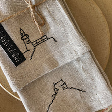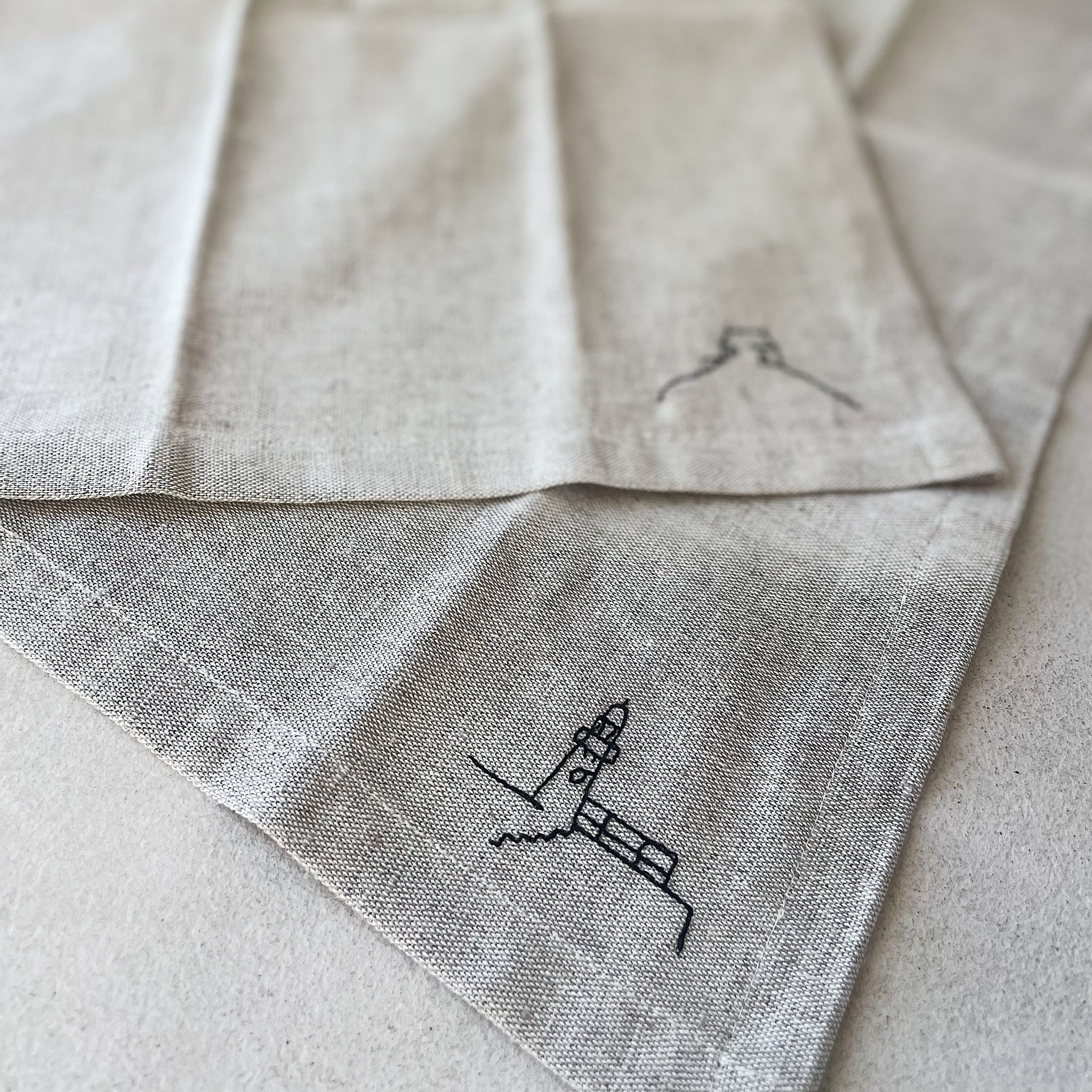 Set of 2 St. Ives 100% Linen napkins. Each napkin features free hand embroidery on the bottom right hand corner. One with Smeaton's pier and lighthouse & the other with the chapel on the Island.