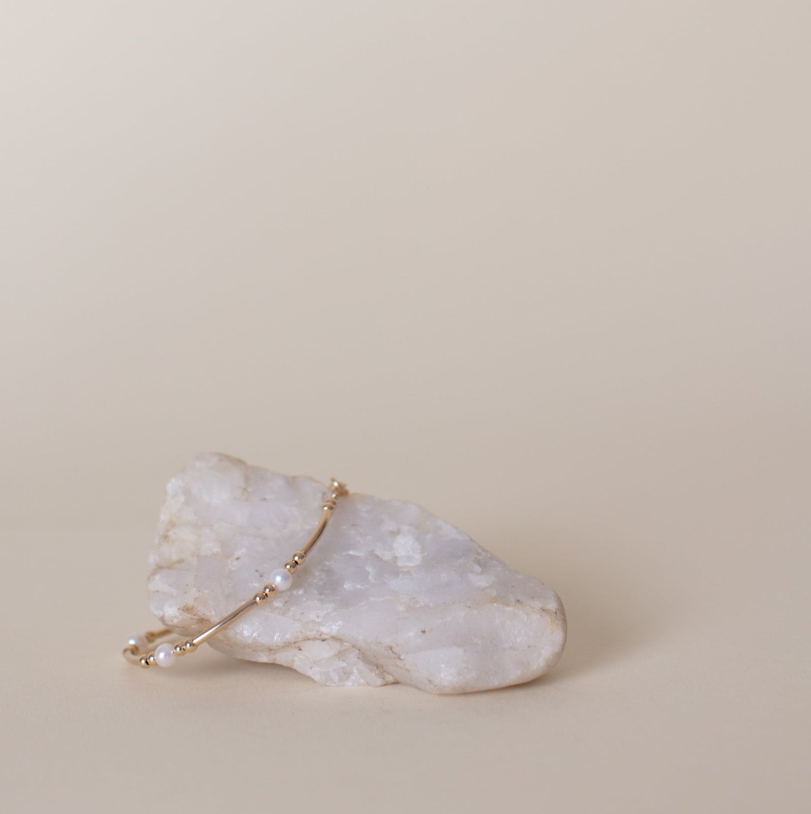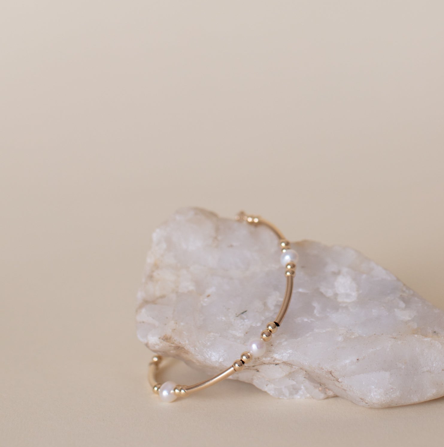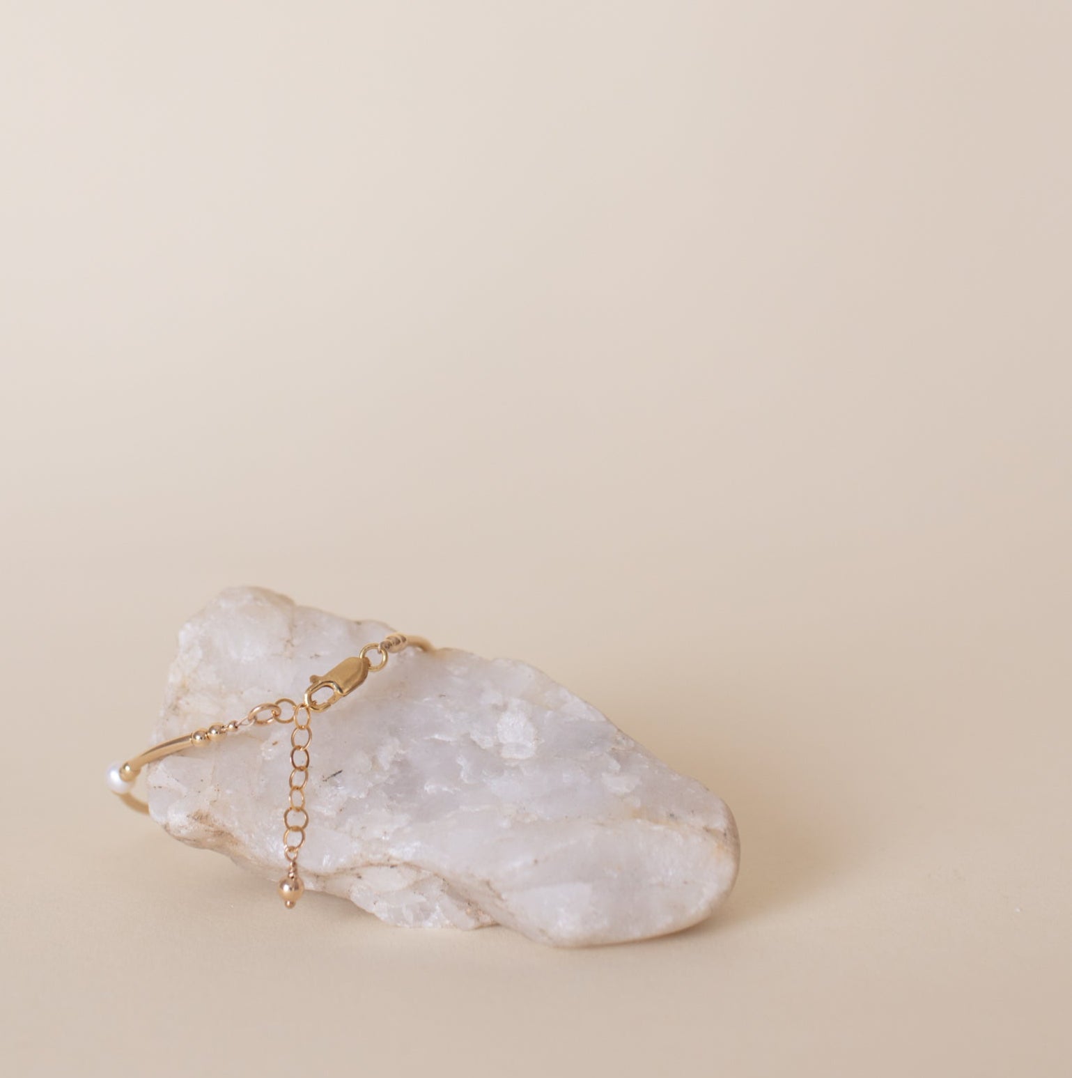 This bracelet combines slender 14-carat gold-fill tubes with lustrous pearls. Designed to be versatile, it transitions effortlessly from casual daytime wear to a polished evening look.